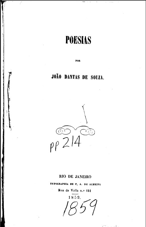 SOUZA, João Dantas de. Poesias. Rio de Janeiro: Typographia de F. A. de Almeida, Rua da Valla, n.º 141, 1859.